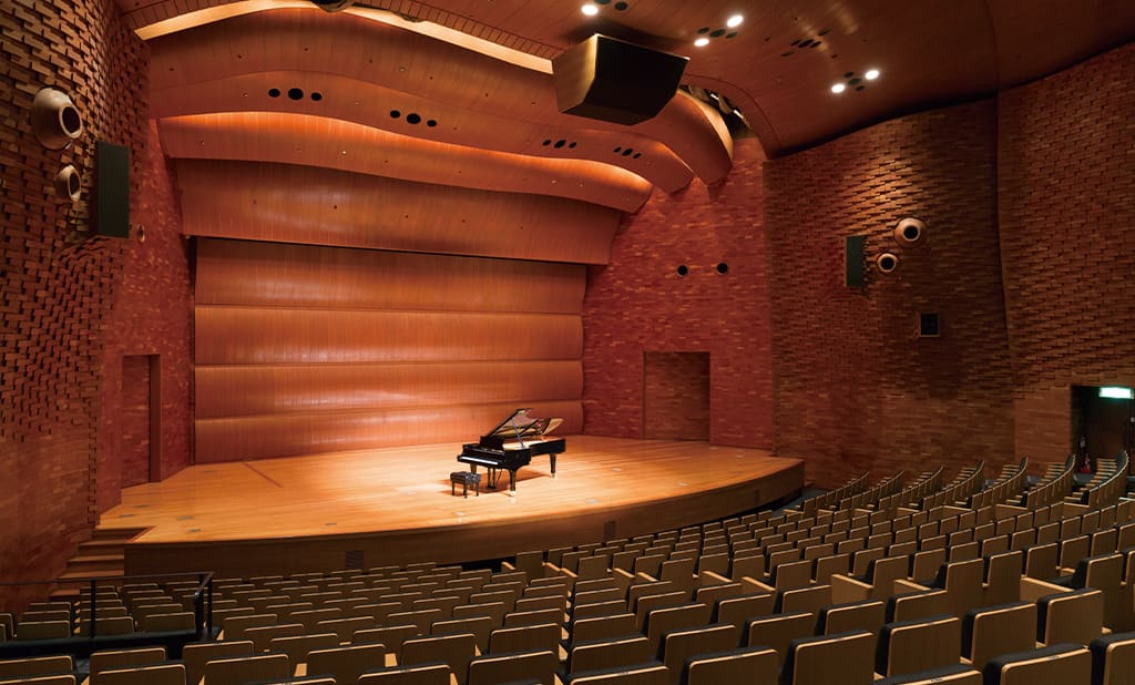 福岡市天神に位置するFFGホールは、建築家・黒川紀章氏が設計したクラシック音楽主体のコンサートホールです。最大の特徴は、赤松を使用した曲線美豊かな内装で、温かみのある音響空間を提供します。コンサートのほか、講演会や研修など多目的に利用され、地域の文化芸術の拠点として親しまれています。