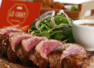 - Hambúrguer Le Chat no bolo do caco (bacon, cogumelos salteados, queijo cheddar e chips de batata doce)