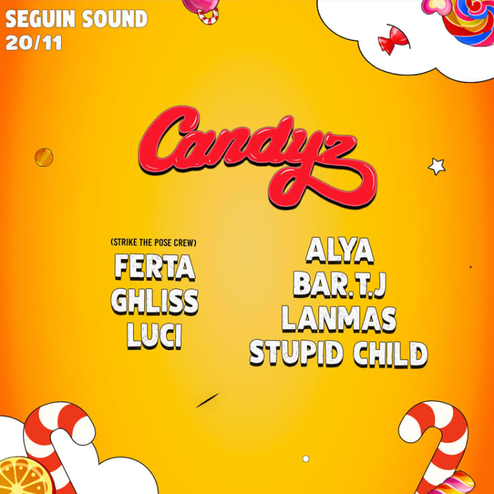 Candyz est de retour pour une soirĂ©e house sucrĂ©e ! Pour l'occasion, le Seguin Sound se transforme en confiserie le temps d'une nuit dĂ©jantĂ©e que tu n'es pas prĂȘt d'oublier. Au programme, le Crew Strike The Pose avec Ferta, Ghliss et Luci pour te faire danser jusqu'Ă l'aube dans une ambiance colorĂ©e et gourmande. Tiens-toi prĂȘt Ă te faire administrer ta dose de sucre rapide !
