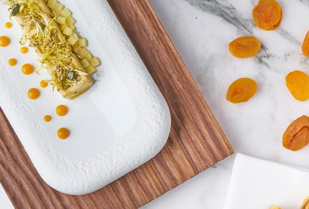 - Rulo de paletilla de cordero glaseada con crema de tupinambo y setas de temporada