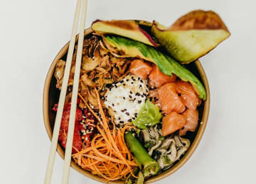 - Toppings (máximo 5): edamame, aguacate en láminas, wakame, granada, huevas de salmón, lima, tomate confitado, queso crema, queso cheddar, remolacha, garbanzos, brotes de cebolla, brotes de remolacha, cebolleta china