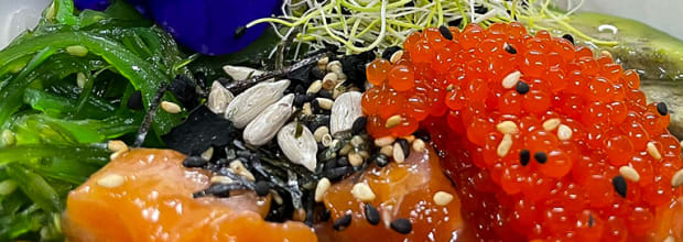 - Flamed Salmon (picante): base de arroz de sushi, salmón flameado, alga wakame, aguacate en láminas, huevas de salmón, salsa handmade Spicy Mayo 100% natural y toque especial de furikake