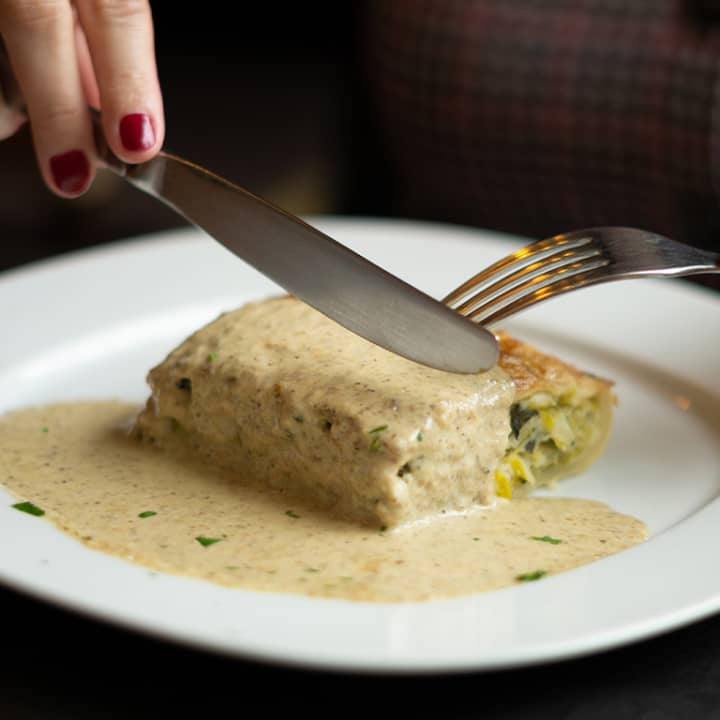 - Hojaldre de puerros y kale con salsa de hongos