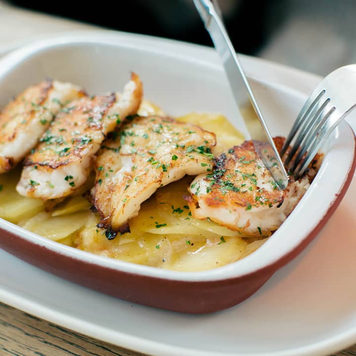 - Lomitos de bacalao en tempura con patatas fritas