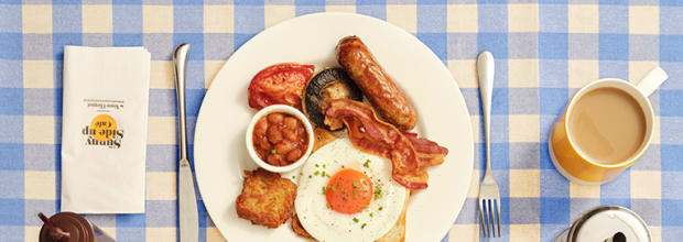 - The Full English: fried egg, 2 pieces of bacon, sausage, tomato, mushroom, hash brown, beans, toast and butter