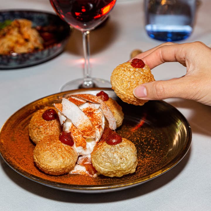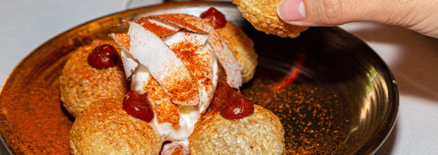 • Panni puri relleno de mousse de chocolate templado con chutney, piña ahumada a la parrilla y helado de coco (media ración)