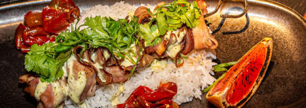• Bun thit de aguja de cerdo ibérico cocinada a baja temperatura, laminada y terminada a la brasa, laqueada con su propio jugo y acompañada con mojo verde, pomelo tatemado y arroz aromático (media ración)