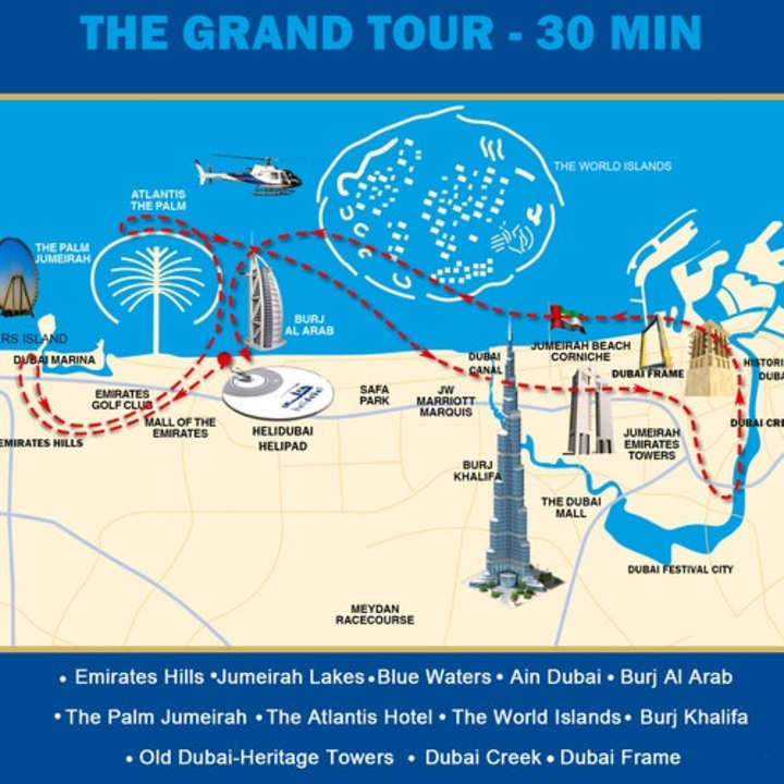 ستأخذك هذه الجولة الكبرى التي تستغرق 30 دقيقة إلى مدينة دبي الصحراوية وتعرض مناظر عين دبي - أطول عجلة فيريس في العالم، ونخلة جميرا، وأتلانتس النخلة، وتلال الإمارات، وأبراج بحيرات جميرا والمزيد. مع استمرار مشاهدتك الجوية، استمتع بشواطئ دبي الشهيرة وستندهش من برج العرب المذهل ذو الـ 7 نجوم وبرج خليفة، أطول مبنى في العالم. انطلق إلى السماء بطائرة هليكوبتر للحصول على منظور جديد للمدينة التي بنيت نفسها من الصحراء. احصل على تذكرتك الآن لحضور جولة مروحية دبي ذات المناظر الخلابة: الجولة الكبرى (30 دقيقة)!