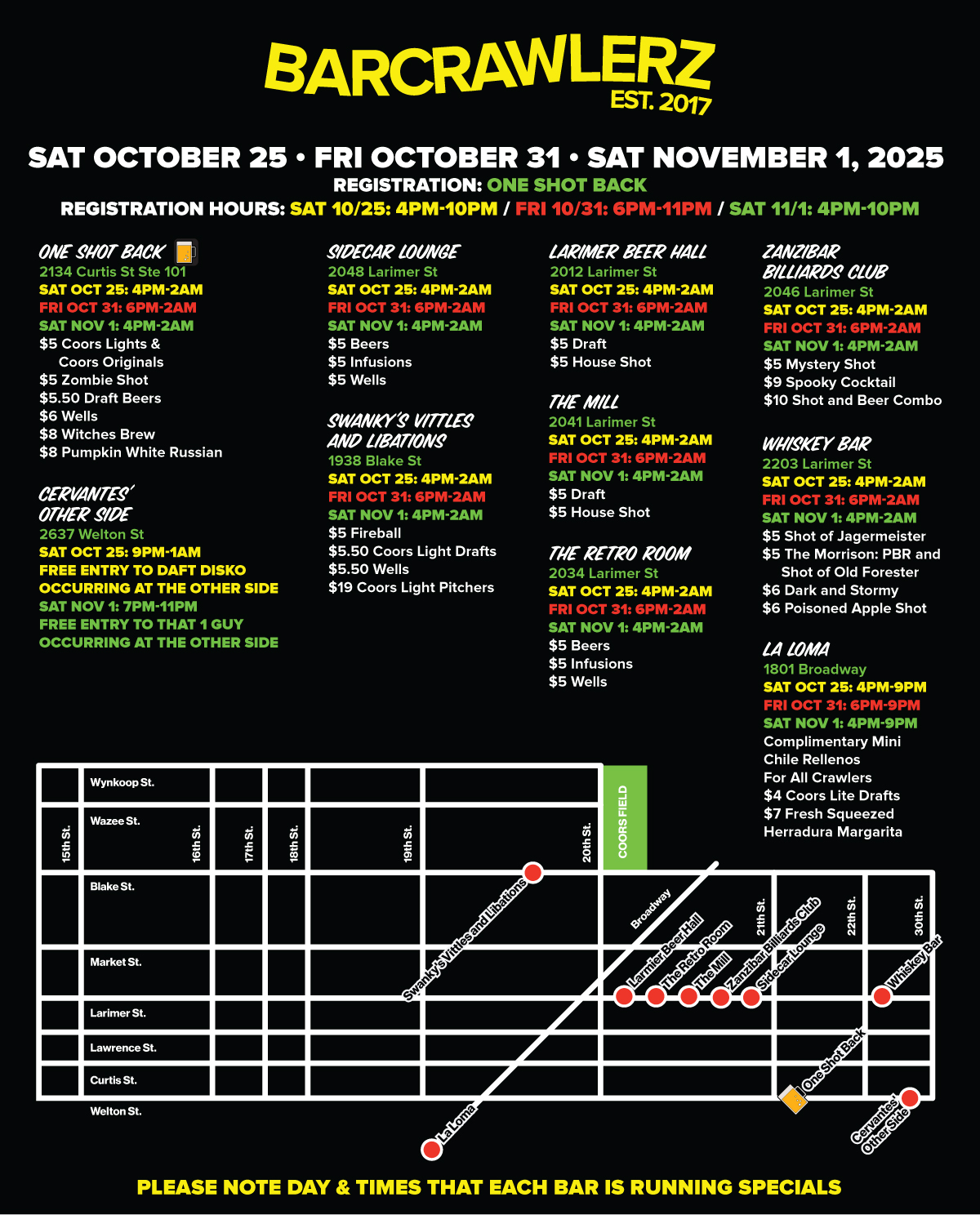 - Check in at One Shot Back - 2134 Curtis Street Ste 101, Denver, CO 80205 to get your wristband and map with participating bars, their location, and their drink specials. (Registration on Saturday 10/25 is from 4PM-10PM, Friday 10/31 is from 6pm-11pm, and Saturday 11/1 is from 4PM-10PM) ***WRISTBAND MUST BE PICKED UP DURING THESE TIMES***
