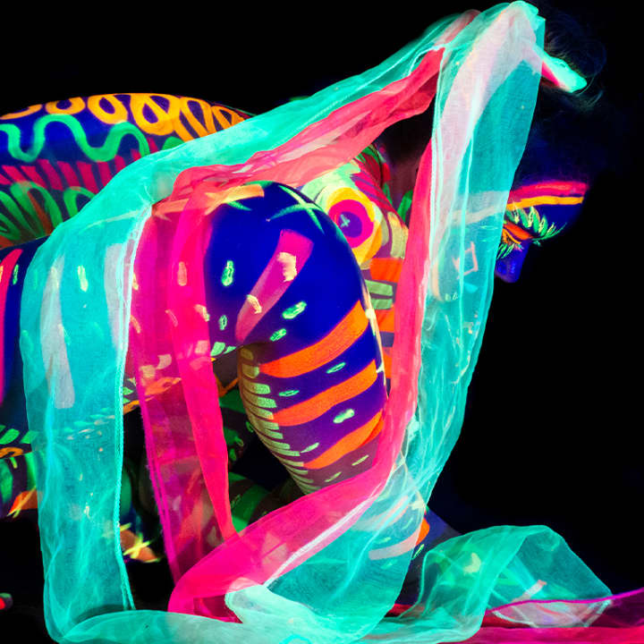 🖌️ Live nude models, adorned with UV paints and accessories