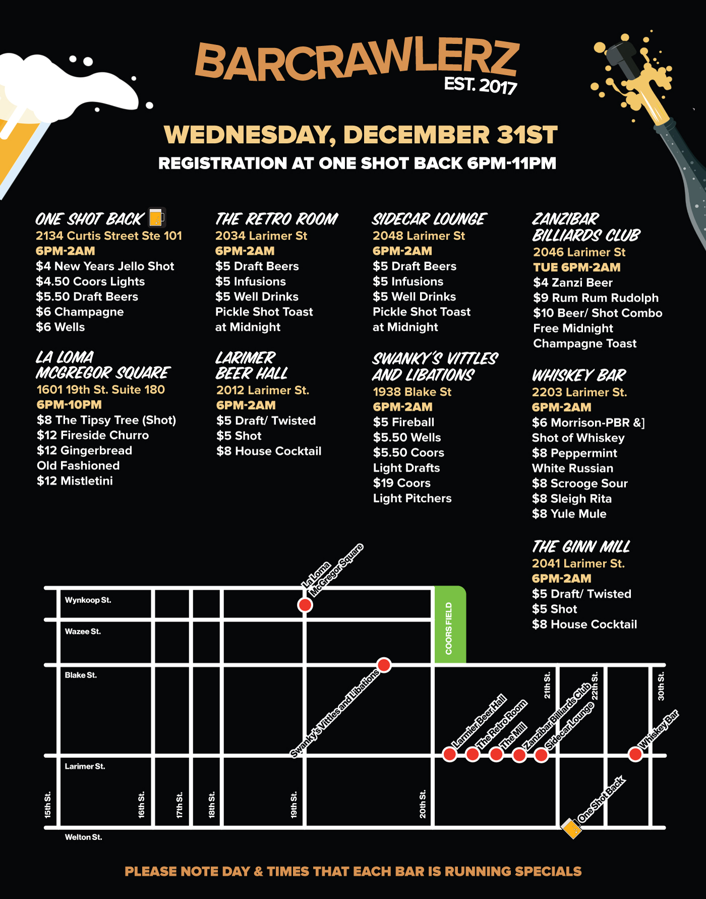 - Check in at One Shot Back - (2134 Curtis Street, Ste 101, Denver, CO 80205) to get your wristband and map with participating bars, their location, and their drink specials. (Registration is from 6 PM-11 PM) ***WRISTBAND MUST BE PICKED UP DURING THESE TIMES***