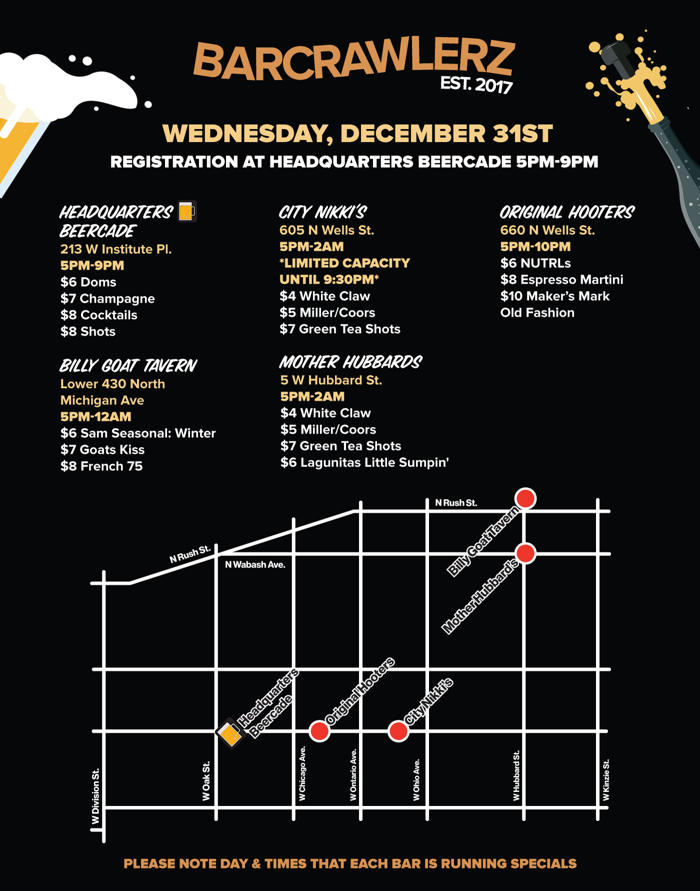 📍 Check in at HQ Beercade - (213 W Institute Pl, Chicago 60610) to get your wristband and map with participating bars, their locations, and their drink specials. (Registration is from 5 PM–9 PM) Wristband must be picked up during these times.