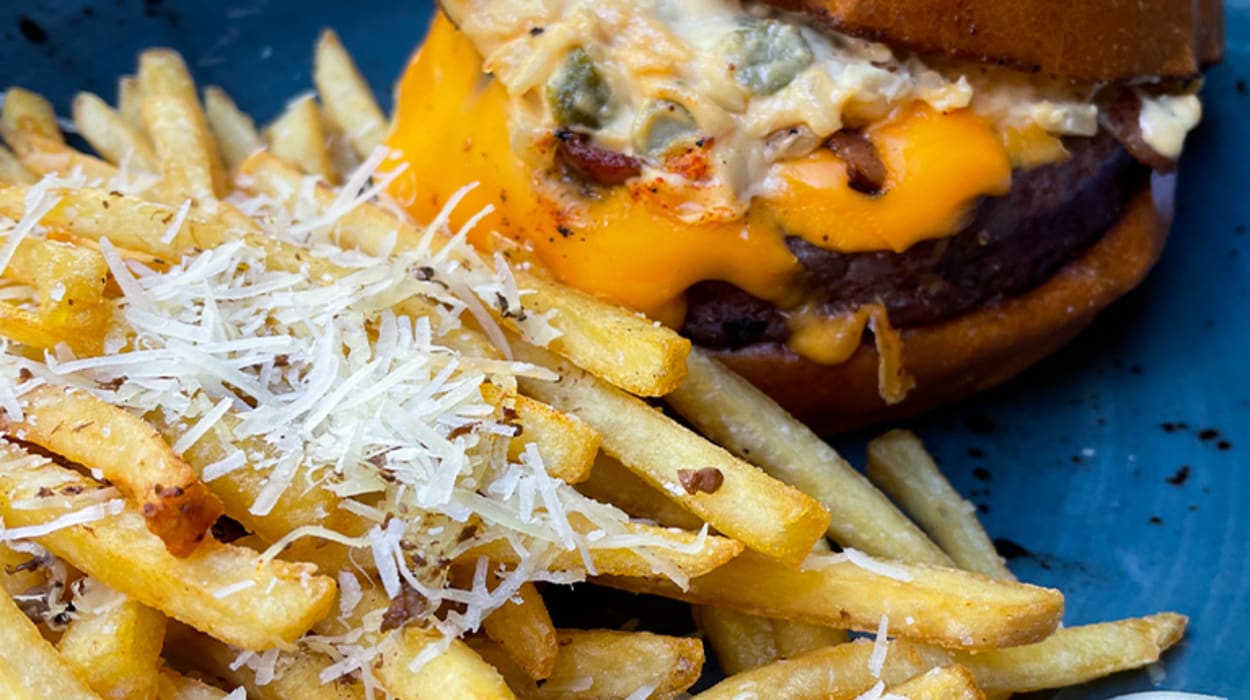 🍔 A delicious 200 gr. burger of their blend of aged Galician blonde, American cheese, bacon, brioche bun and caramelized onion-miso with special sauce and truffled parmesan fries