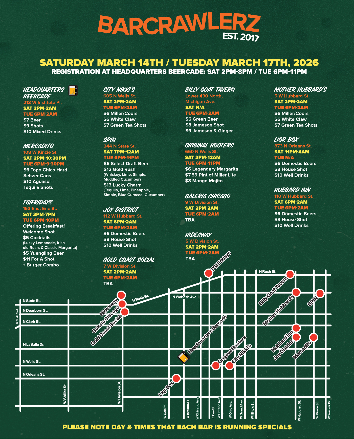 2) Regístrate en Headquarters Beercade (213 W Institute Pl) para obtener tu pulsera y un mapa con los bares participantes, su ubicación y sus especiales en bebidas. (Registro el sábado 14/3 de 2PM a 8PM y el martes 17/3 de 6PM a 11PM) ***LA PULSERA DEBE RECOPILARSE DURANTE ESTOS HORARIOS***