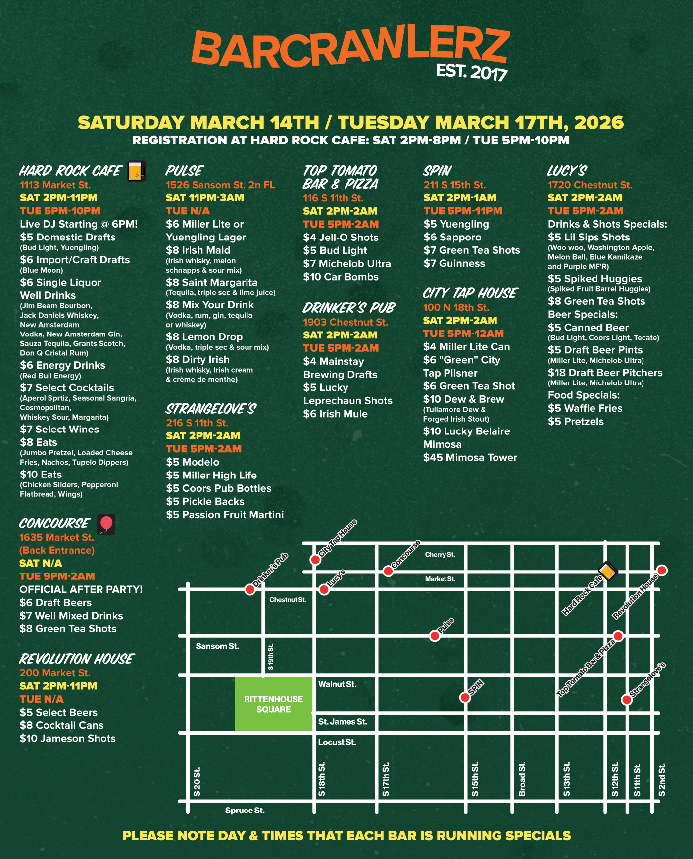 2) Regístrate en Hard Rock Cafe (1113 Market St.) para obtener tu pulsera y un mapa con los bares participantes, su ubicación y sus especiales en bebidas. (Registro el sábado 14/3 de 2PM a 8PM y el martes 17/3 de 5PM a 10PM) ***LA PULSERA DEBE RECOGERSE DURANTE ESTOS HORARIOS***