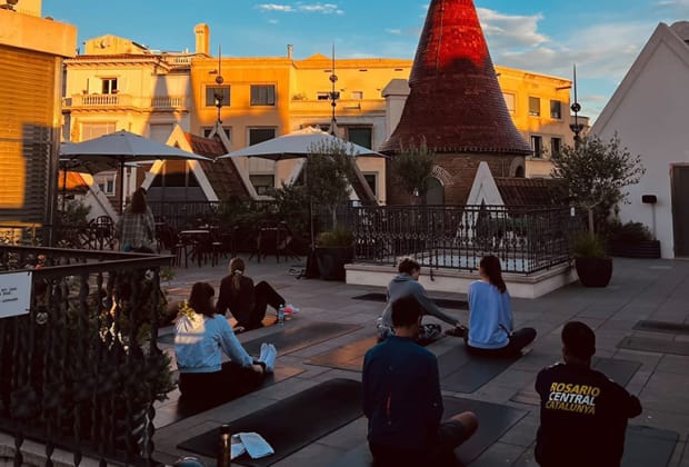 Clase de yoga en edificio modernista Casa Les Punxes