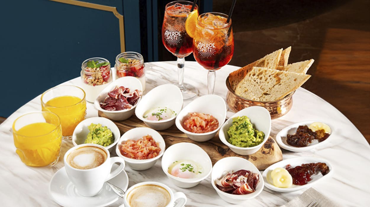 🥑 Un delicioso y completo brunch con platos dulces, ingredientes salados, Aperol, zumo de naranja y café