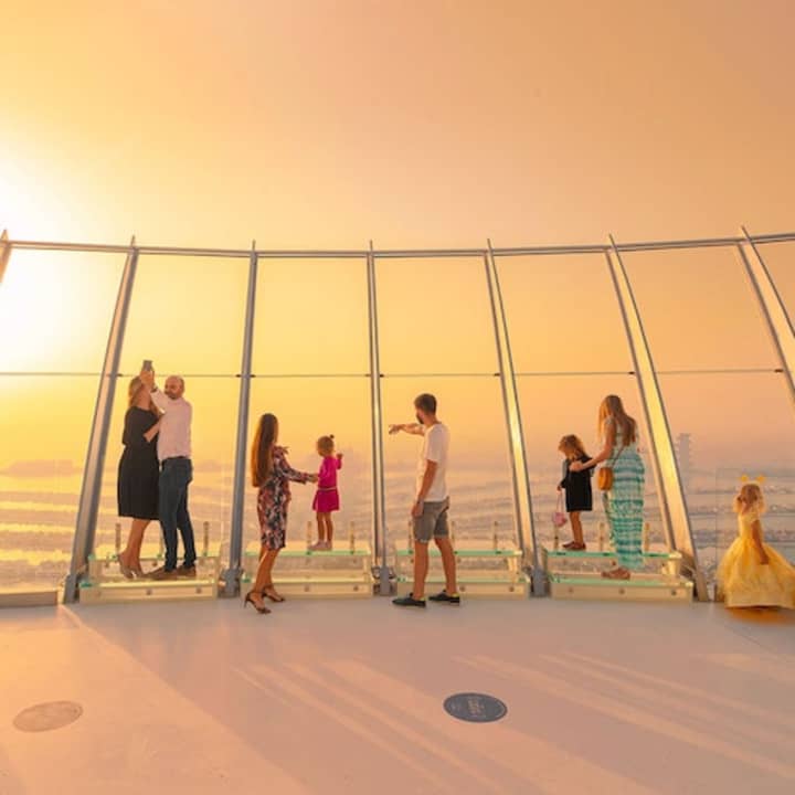 🌆 استمتع بمشاهدة أفق دبي المذهل من منصة المراقبة بزاوية 360 درجة في الطابق 52 من برج النخلة الشهير