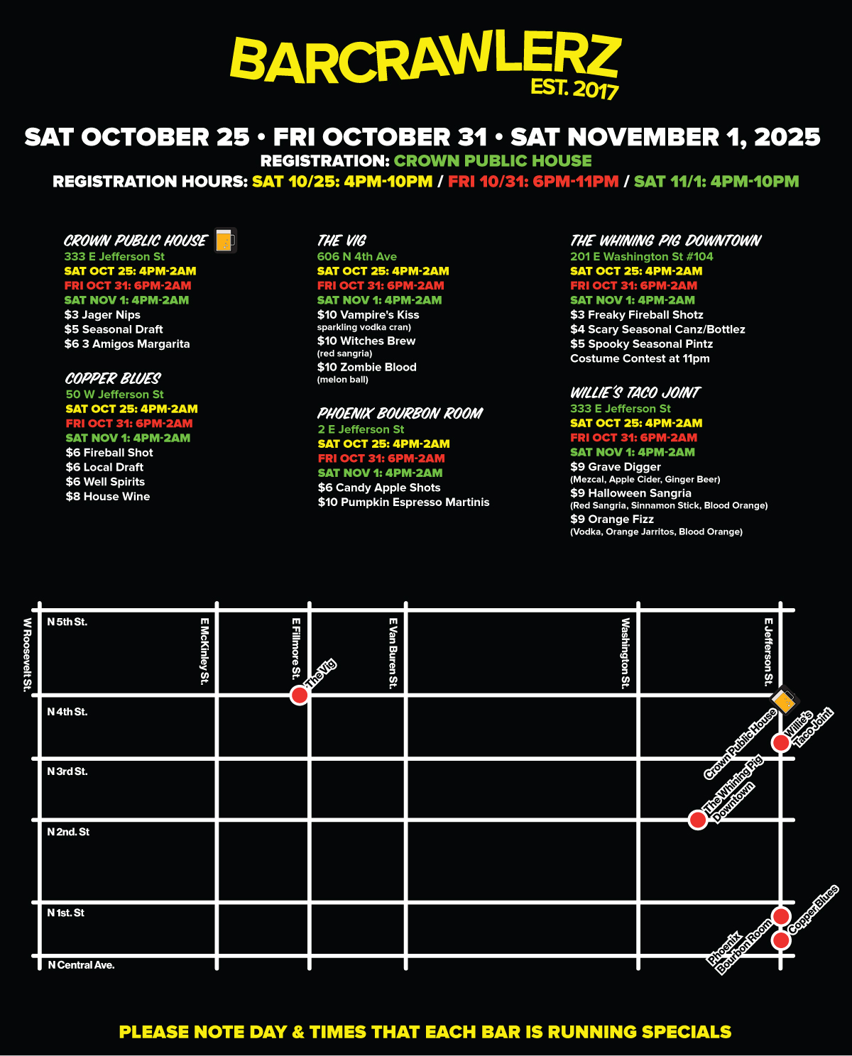 - Check in at Crown Public House - 333 E Jefferson St, Phoenix, AZ 85004 to get your wristband and map with participating bars, their location, and their drink specials. (Registration on Saturday 10/25 is from 4PM-10PM, Friday 10/31 is from 6pm-11pm, and Saturday 11/1 is from 4PM-10PM) ***WRISTBAND MUST BE PICKED UP DURING THESE TIMES***