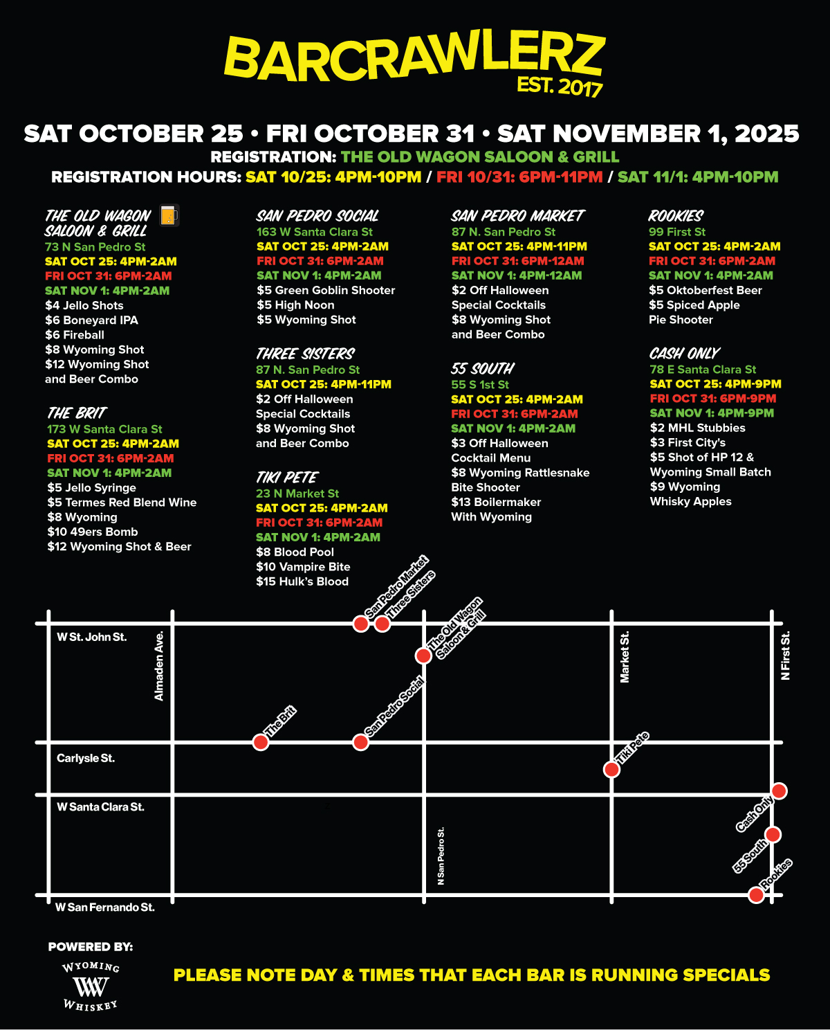 - Check in at The Old Wagon Saloon & Grill - 73 N San Pedro St, San Jose, CA 95110 to get your wristband and map with participating bars, their location, and their drink specials. (Registration on Saturday 10/25 is from 4PM-10PM, Friday 10/31 is from 6pm-11pm, and Saturday 11/1 is from 4PM-10PM) ***WRISTBAND MUST BE PICKED UP DURING THESE TIMES***
