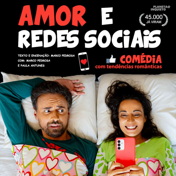 Alguma vez deste por ti a espreitar um telemóvel que não era teu? Ou tiveste uma crise de ciúmes à custa de um like? Mas quase de certeza que já andaste a pesquisar um ex-namorado nas redes sociais... Um factor absolutamente inesperado irá surpreender este casal, Miguel e Susana, a viver uma relação com altos e baixos. Mas nada os preparou para uma surpresa que virá de onde menos esperam: das redes sociais, onde flertam e seduzem a seu belo prazer, e realizam novas conquistas. Ciúme, intriga, raiva, confiança, e mais, num tom humorístico que oscila entre o nonsense e o humor negro. Consegue já os teus bilhetes para Amor e Redes Sociais em Lisboa!