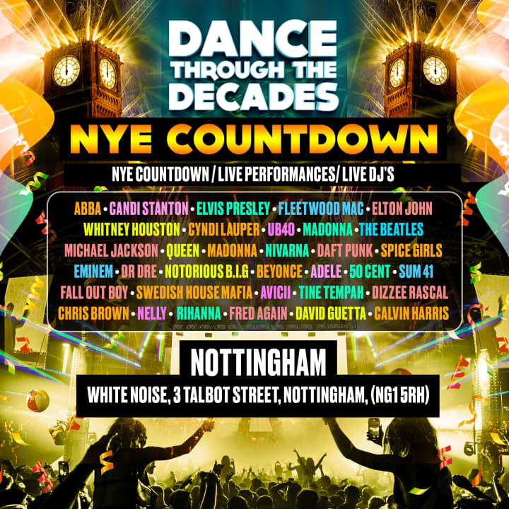 Get ready for the ultimate time-traveling musical journey at the "Dance Through the Decades" New Year's Eve Party in Nottingham! Join a night of electrifying nostalgia as you dance through the ages. Step into a time machine that will transport you through the iconic music and culture of the 60s, 70s, 80s, 90s, 00s, and beyond. It's a one-of-a-kind musical journey that you won't want to miss! Talented live DJs will guide you through the decades with a carefully curated playlist and show that celebrates the greatest hits and dancefloor anthems of each era. From Abba to Adele, Elvis to Eminem, Queen to Rihanna, itβs all covered. Sing, dance, and reminisce to the best of every era, ensuring a night full of energy, excitement, and unforgettable memories. Don't miss out on the most epic New Year's Eve party in Nottingham, get your tickets now!