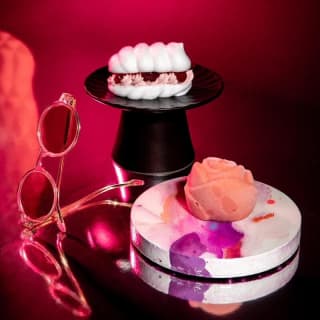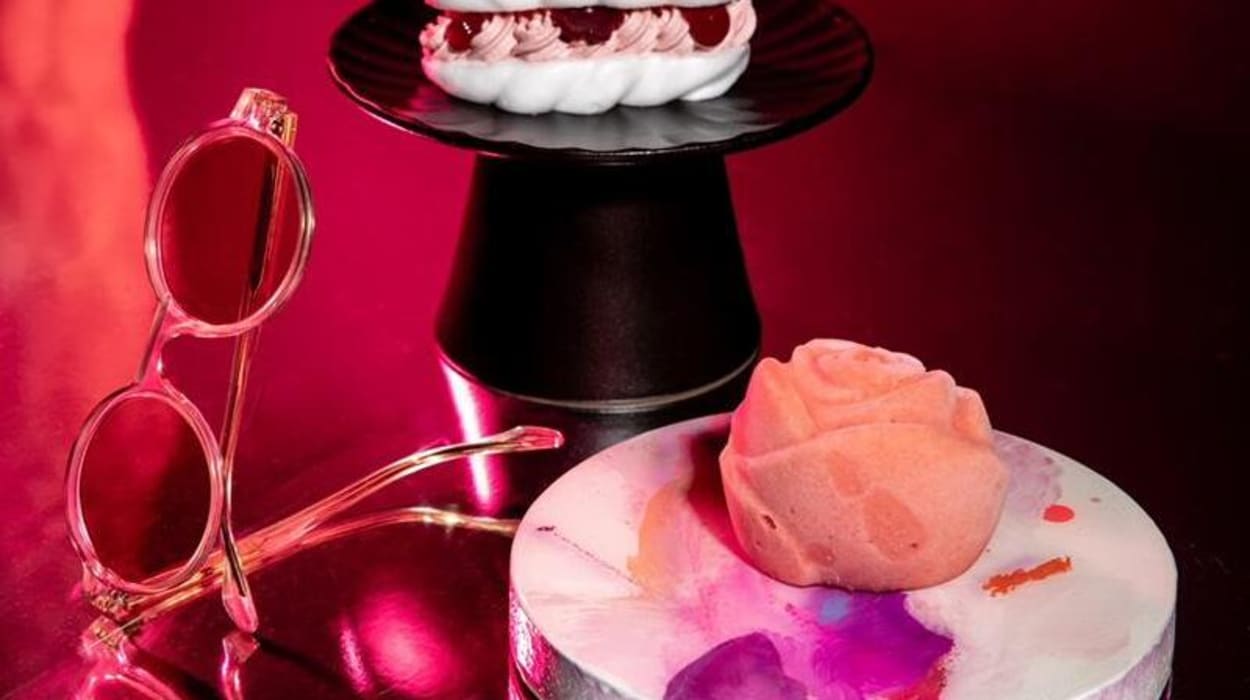 BESO tabaco: toffee de lúpulo de Estrella Damm, mousse de avellana tostada & Domingo en la ciudad: tarta al wishkey, algodón de azúcar y melón, piruleta explosiva de golosinas de melón ácido.