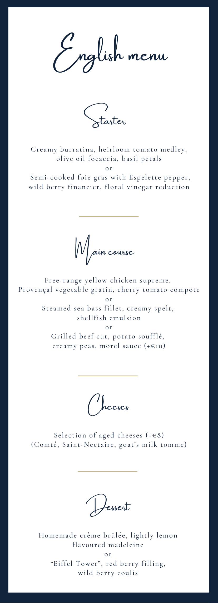 🥘 A refined menu of seasonal products carefully prepared in the purest French culinary tradition