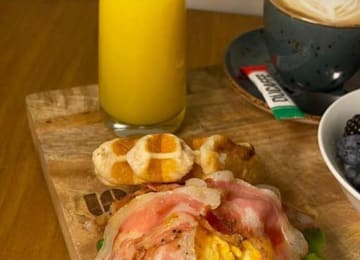 - Sándwich con pan gofre: con huevo, guanciale, espinacas baby y queso crema