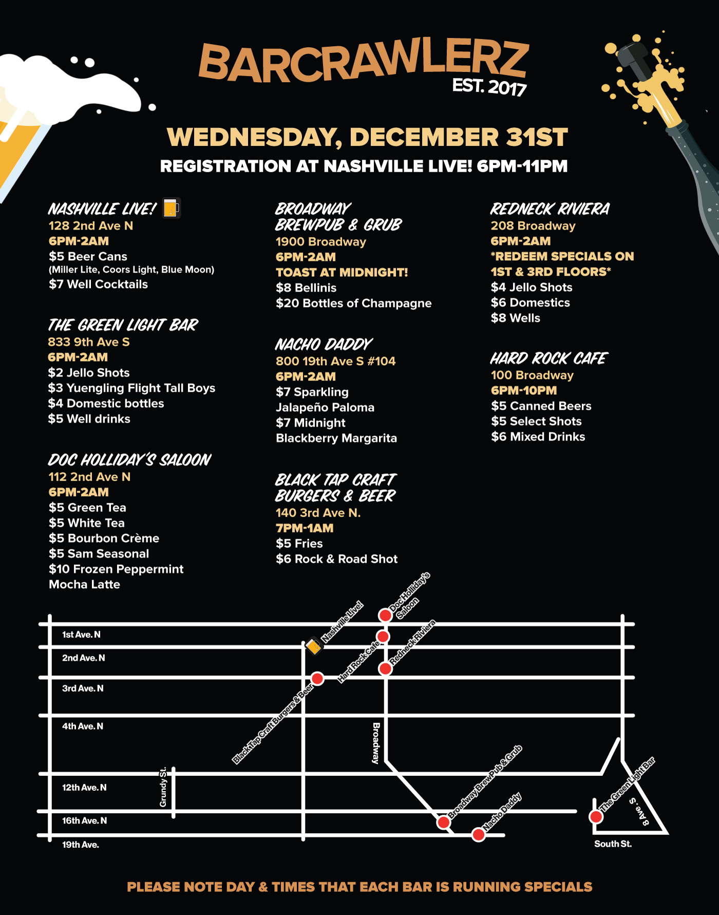 - Check in at Nashville Live! - (128 2nd Ave N, Nashville, TN 37201) to get your wristband and map with participating bars, their location, and their drink specials. (Registration is from 6 PM-11 PM) ***WRISTBAND MUST BE PICKED UP DURING THESE TIMES***
