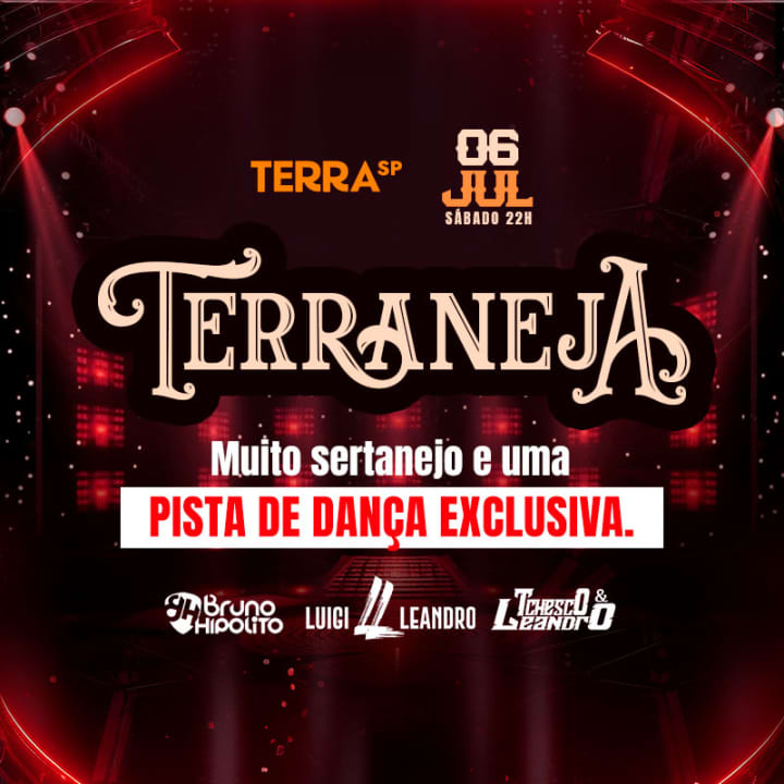 ⭐ A balada sertaneja mais querida está confirmada neste sábado no Terra SP! O Terraneja no Terra SP traz Bruno Hipólito, Luigi & Leandro e Tchesco & Leandro cantando os maiores clássicos do sertanejo universitário. Venha curtir a melhor balada sertaneja no Terra SP!