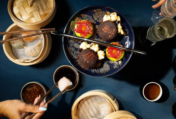 🥟 Indulge in a tiered stand for two filled with Cantonese-influenced delicacies, including Salmon & Pork Bao Sandos, signature Duck Puffs, and traditional Dim Sum