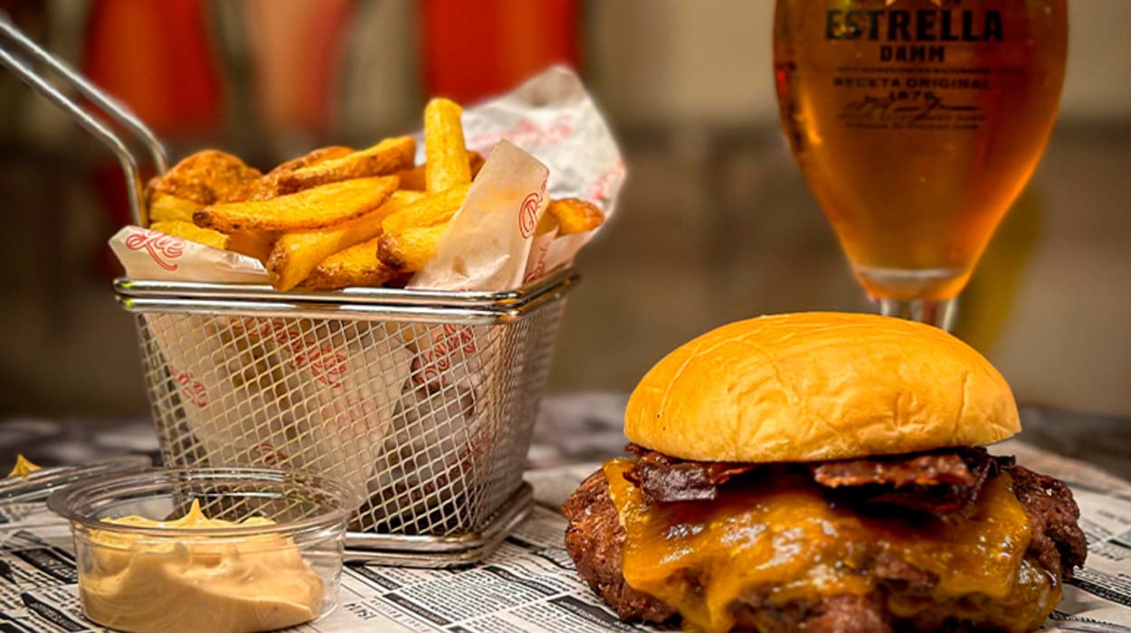 Menú burger en Boogie, Madrid🎫 Un double cheese bacon + patatas boogie blend + bebida (refresco, agua o cerveza)