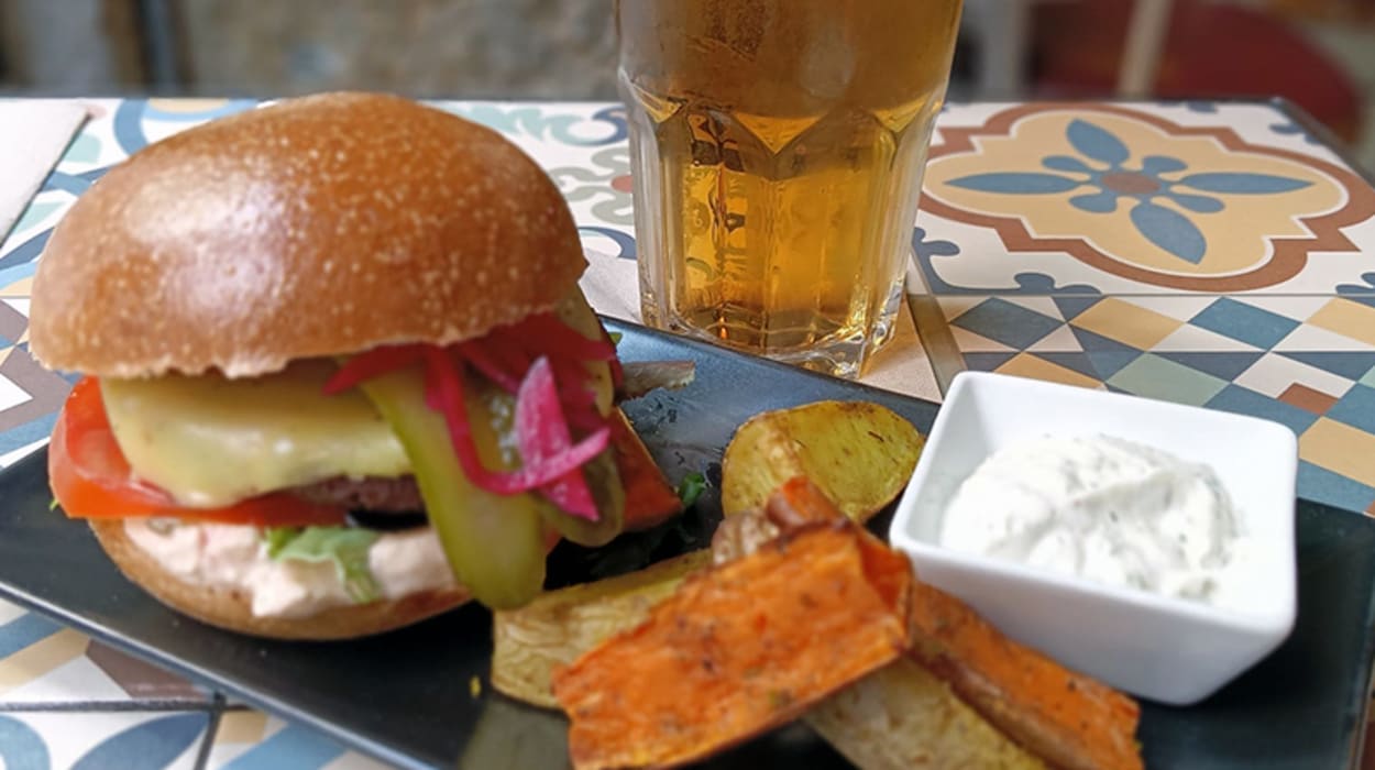 Schenke dir einen genussvollen Nachmittag und koste einen leckeren hausgemachten Soja-Rote-Bete-Burger mit "Cheddar"-Käse, eingelegtem Gemüse, Sriracha-Mayo, Pommes mit Süßkartoffeln und Tartarsauce – und das alles inklusive Getränk! Genieße deinen veganen Burger mit Getränk in Madrid!