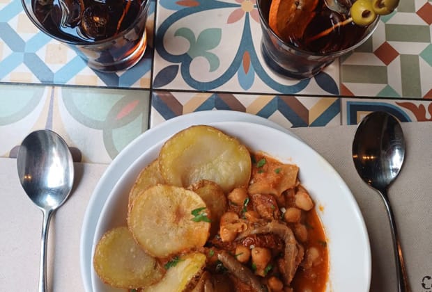 ¡Disfruta de una merienda castiza Vegana para dos personas en Malasaña! Porque lo castizo no quita lo vegano, te invitamos a pasar una tarde disfrutando de nuestros clásicos madrileños. Incluye una ración de callos a la madrileña, de setas con garbanzos y papas rústicas, dos bebidas y, para terminar, la famosa tarta de queso sin queso y mermelada de frutos rojos. ¡Disfruta de tu merienda castiza y vegana pra 2 en Vega Luna, Madrid!