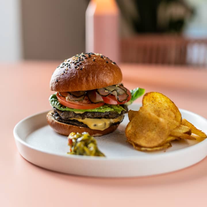 - Portobello burger (Portobello medallion and white beans with carrots, mkm sauce, lettuce, tomato and pickled cucumbers)