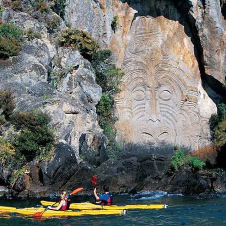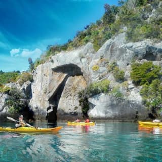 Embark on an epic adventure at Lake Taupo by kayaking to the Maori Rock Carvings in Mine Bay! Start your journey from the gorgeous Acacia Bay, paddle through stunning cliffs, lush bush, and hidden inlets only accessible by kayak. Learn about the carvings' cultural significance from our expert guide, then enjoy gourmet treats and a refreshing swim in the crystal-clear waters. If the wind picks up, get ready to sail back together on your kayaks - it's pure bliss! Departures at 8:30am and 1:30pm in summer, 10:00 am and 1:30pm in winter from Acacia Bay. Get your tickets for Half-Day Kayak to the Maori Rock Carvings in Lake Taupo!