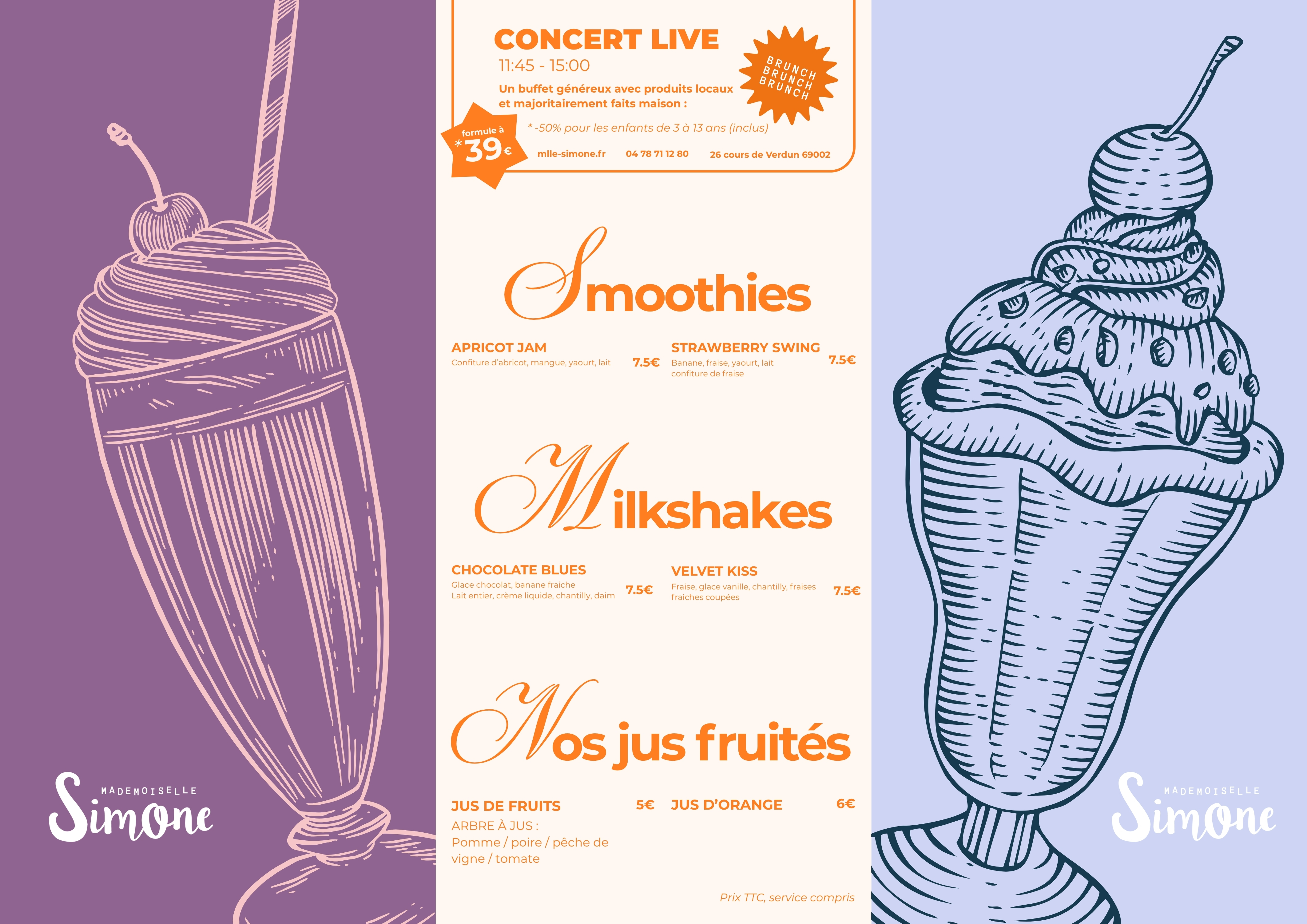 - Pour ajouter une touche de plaisir à ton expérience, profite également de la musique live qui accompagnera ton brunch. Laisse-toi envoûter par des mélodies enjouées pendant que tu dégustes tes plats préférés et savoures l'ambiance animée. Que tu sois seul, en couple, ou en famille, notre brunch convivial, délicieux et musical est l'occasion parfaite de te retrouver et de te régaler ensemble. Achète ton billet dès maintenant pour un Brunch Musical en Presqu'île Lyonnaise chez Mademoiselle Simone !