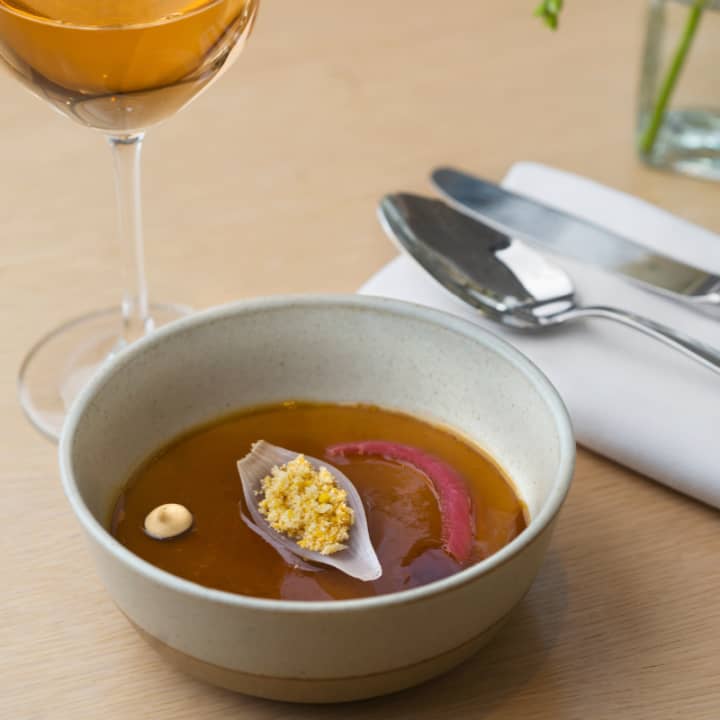 • De un sutil dulzor: Royale de cebolla, migas de pan, regaliz del gallinero al plato