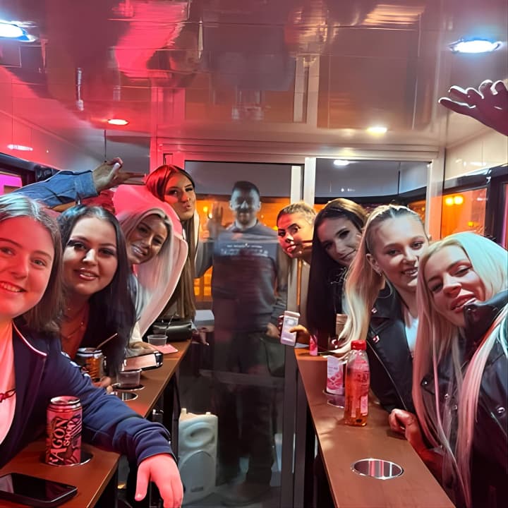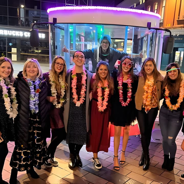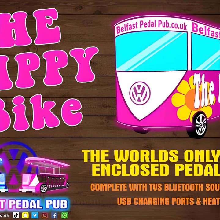 Hop on The Hippy Bike, Belfast's exclusive pedal pub that keeps the party rolling rain or shine! This unique 12-seater brings the comforts of home on the road, from TVs and a killer Bluetooth sound system to cozy electric heaters. With panoramic windows, you'll be in your own VIP bubble, turning heads and cranking your tunes as the city cheers you on. Perfect for keeping your party look on point! Get your tickets for The Hippy Bike Fully Enclosed Party Bike Tour!