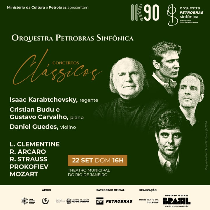 No dia 22 de setembro, a Orquestra Petrobras Sinfônica apresenta um concerto grandioso. Ao lado de seu diretor artístico e maestro titular, Isaac Karabtchevsky, a orquestra convida os pianistas Gustavo Carvalho e Cristian Budu para interpretar peças de R. Strauss e Prokofiev, respectivamente, e, juntos, o Concerto para 2 pianos de Mozart. Completam o programa obras de Leonardo Clementine e Rafael Marino Arcaro, selecionadas na XXV Bienal de Música Brasileira Contemporânea, com solos de violino de Daniel Guedes.
