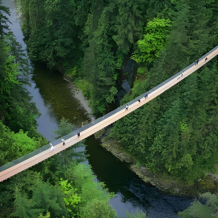 🌲 Camina por el puente colgante Capilano, rodeado de exuberante selva tropical