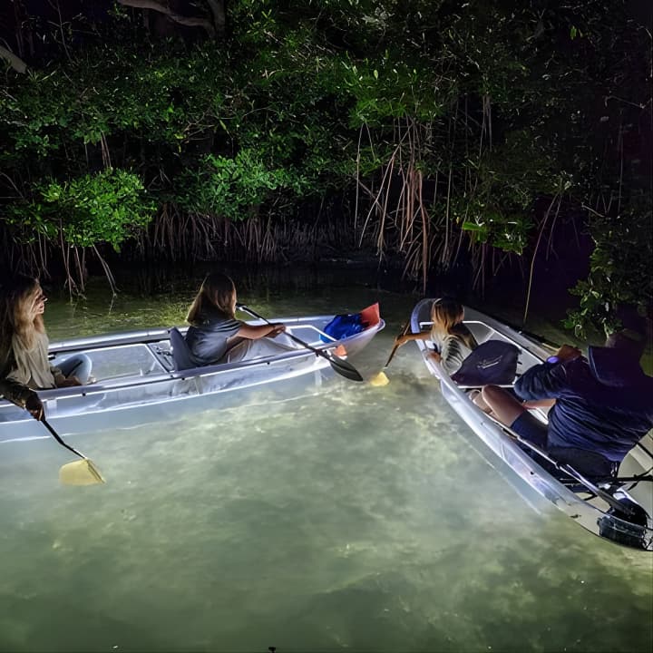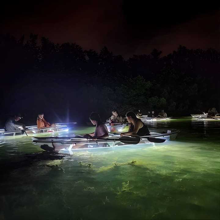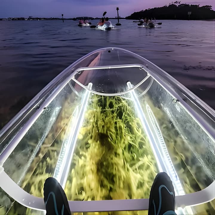 🛶 Experience a unique night paddle in a glass-bottom kayak, perfect for any fitness level.