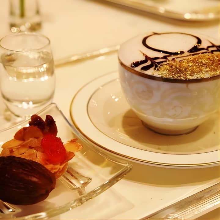 ☕ تذوق كابتشينو بالاس الذهبي المزين برقائق الذهب عيار 24 قيراط.