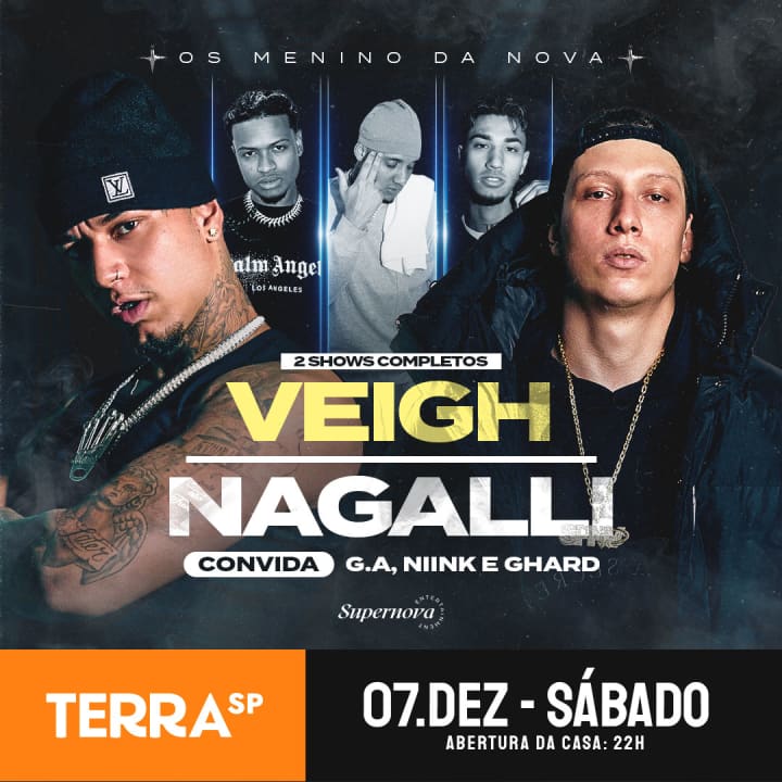 Show do Veigh & Nagalli convidando Niink, G.A e GHARD no Terra SP | Idade +18 🔥 E aí, galera! Os Meninos da Nova estão de volta no Terra SP, e você não pode ficar de fora dessa! 🔥