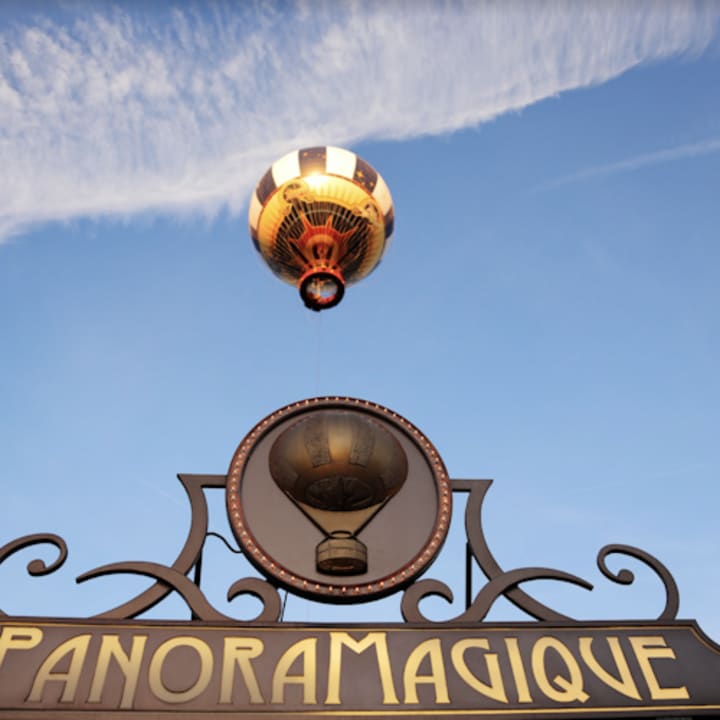 Get ready to soar 100 meters above Disney Village® for a six-minute hot-air balloon ride that takes in Disneyland Paris and the surrounding area. After a bird's-eye view of Sleeping Beauty's castle and the park's thousands of fans, an electric winch brings you back down to earth. This huge Disney hot-air balloon can accommodate up to 30 passengers at a time, allowing families and groups of friends to enjoy the view together. Buy your tickets for this PanoraMagique hot-air balloon ride at Disney® Village!
