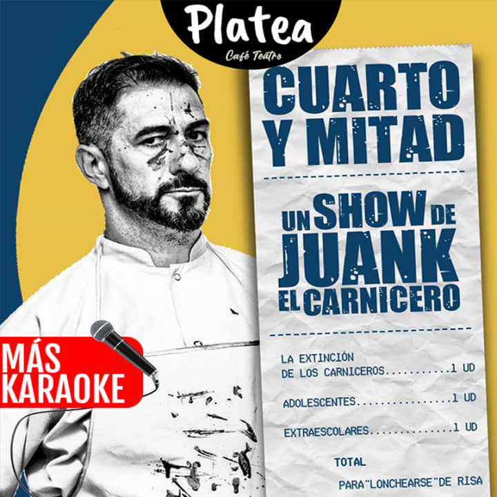 Juank presenta su monólogo de cómo ve el mundo siendo padre, carnicero y cómico, una combinación de la que saldrán cosas inesperadas. En Platea encontrarás shows de comedia, magia, teatro infantil, Impro, música en directo. Después del monólogo incluso podrás tomar el escenario y canta en el karaoke. ¿Te vienes esta vez a descubrir este divertido monólogo y a cantar tus canciones favoritas? ¡Consigue tus entradas para este Monólogo de Juank en Platea, Madrid!