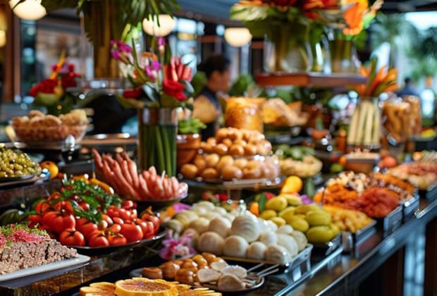 😋 Régale-toi avec une variété de plats chauds, froids, sucrés, salés et de boissons... à volonté !