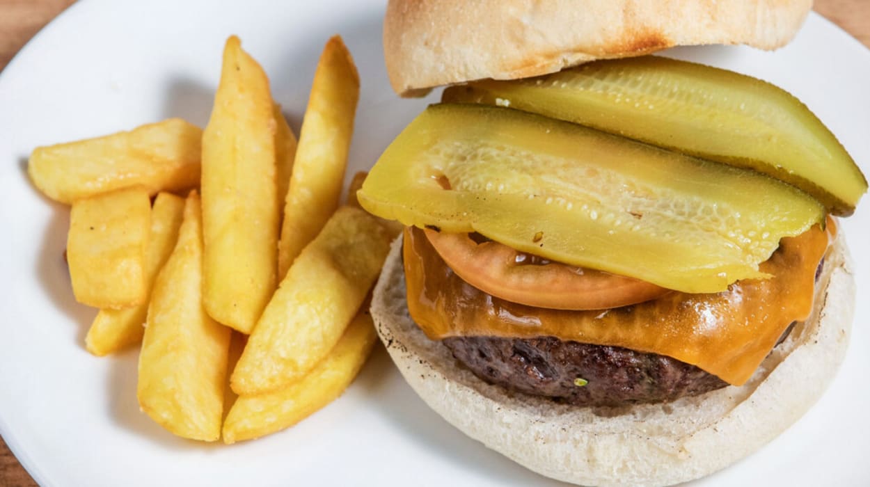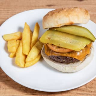 - The classic: fresh tomato, cheddar cheese and pickle Vegan veggie beef burger