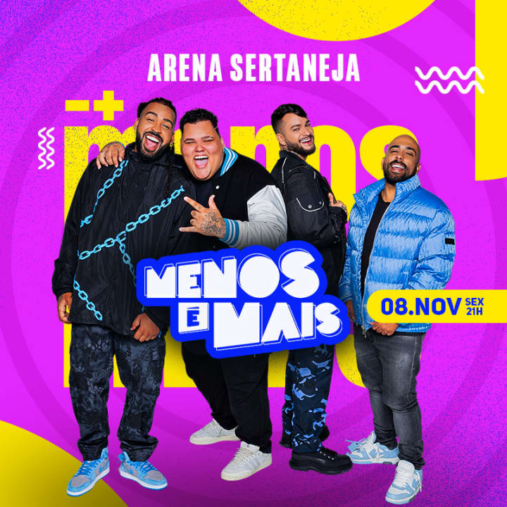 Show do Menos é Mais no Arena Sertaneja 🎶 Atenção, pagodeiros de plantão! O grupo mais amado do Brasil chega ao Arena pela 1ª vez, para uma noite de muita animação e alegria! O Show do Menos é Mais está confirmado. COMPRE HOJE E APROVEITE O LOTE ATUAL! 🚨